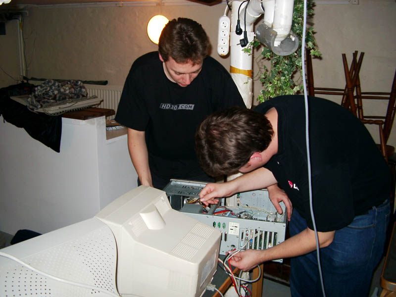 Hardwaremysteriet var sat i gang. Desværre var det blevet sent fredag aften, og Myggen havde familie ærinder lørdag, men medbragte en ny forsyning strømforsyninger lørdag eftermiddag. Mysteriet er ikke løst, men maskinen kører da nu ved fælles hjælp fra mange forskellige FUP'ere og et par donor strømforsyninger. Man kan vel sige at Myg, Mrtin og Argh hardware ikke nødvendigvis er den bedste kombination.